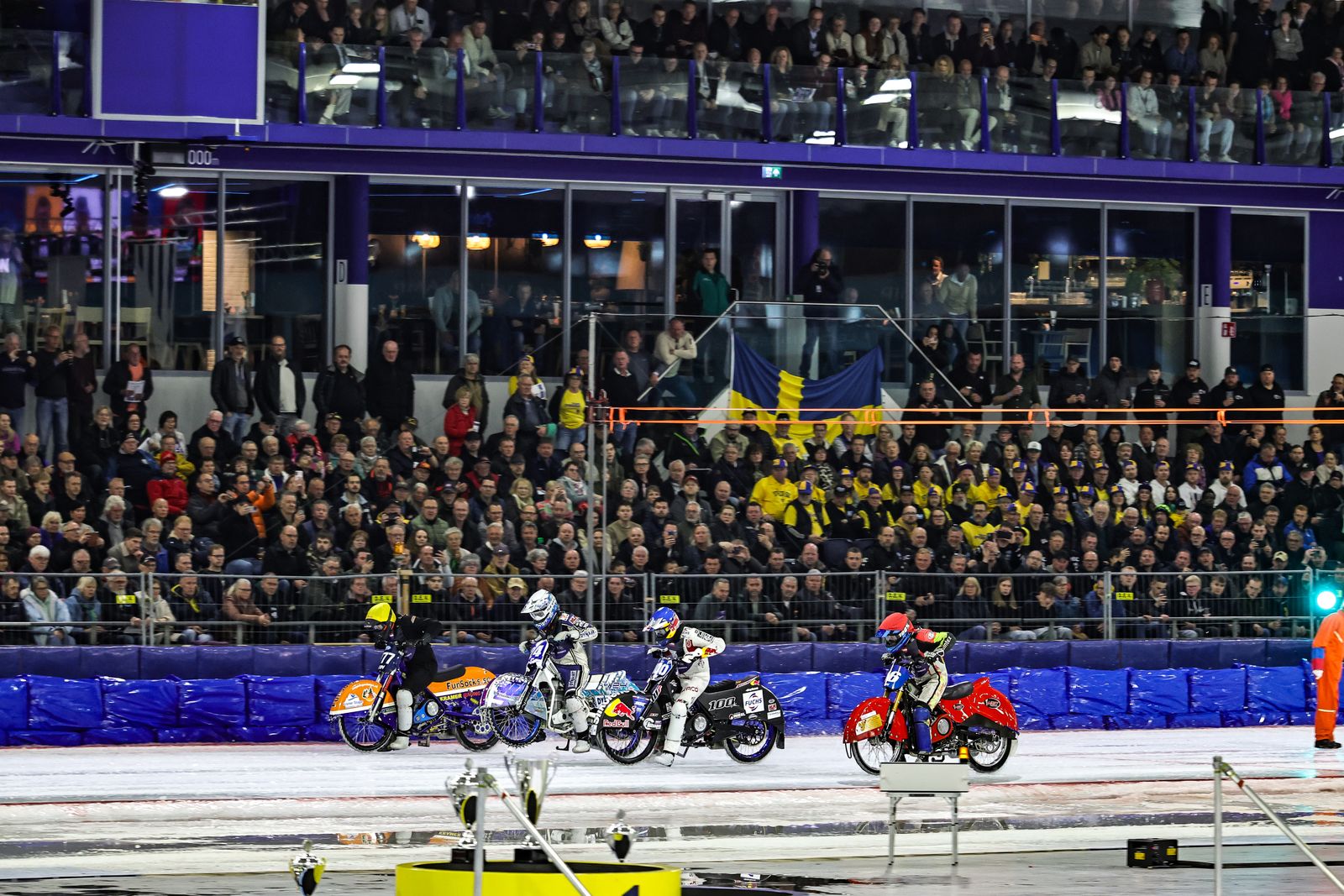 With his compatriot Martin Haarahiltunen unable to compete because of injury, the thirty-five-year-old Swede – who trailed the four-time and defending champion by just two points after the second and penultimate Final of the season in Inzell last month – barely put a wheel wrong as he traded his 2025 silver medal for gold this time around with a dazzling display of controlled aggression. Haarahiltunen’s premature exit from the 2026 title fight – following surgery on a fractured left tibia sustained in Inzell’s dramatic second Grand Final – meant the leading three riders heading into the season showdown in the Thialf Ice Stadium were separated by just four points with Svensson two ahead of Finland’s Max Koivula who in turn was two clear of Luca Bauer from Germany. With the final medal positions too close to call, the atmosphere in the packed Dutch stadium was electric and the racing lived up to all expectations with the three championship contenders ensuring the battle for the 2026 crown went down to the wire in the concluding Grand Final of the season. Fast Finn Heikki Huusko got proceedings under way with a comfortable win in the programme’s opening Heat ahead of Lukáš Hutla from the Czech Republic before Bauer – despite racing with heavy bruising sustained in a practice crash earlier in the day – led home Dutch hero Jasper Iwema. Koivula then opened his account with victory from Austrian veteran Harald Simon and Svensson signalled his intentions with a tapes-to-flag win chased by Germany’s Max Niedermaier. Huusko, who was lying sixth in the standings at the start of the day, added another win in his second Heat ahead of Bauer and Koivula before Niedermaier raced to victory with Simon – who was competing in his first Final in three years – claiming another second-placed finish. Svensson then won again – this time at the expense of Austria’s Franz ‘Franky’ Zorn – with Dutchman Sebastian Reitsma completing the second block with an incredibly popular victory ahead of Martin Posch. The two-way tie at the top continued through the third block of Heats with Huusko winning from Iwema and Svensson leading home Bauer as Koivula bounced back into contention with victory over Niedermaier and Simon won a restarted twelfth Heat ahead of Austria’s Posch. With the format – reworked for 2026 – fast-tracking the top two racers after the Heats straight into the Grand Final with the next four progressing to the Last Chance Heat, with two blocks remaining it was Svensson and Huusko who shared a two-point lead on nine apiece ahead of a four-way tie for third between Koivula, Bauer, Simon and Niedermaier.